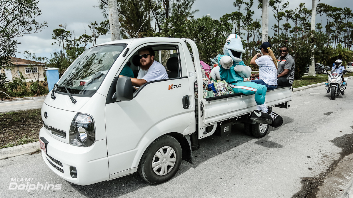 Miami Dolphins mascot T.D. and The Miami Dolphins partake in a Hurricane Dorian relief trip on October 5th, 2019. (Jose Pineiro/Miami Dolphins)