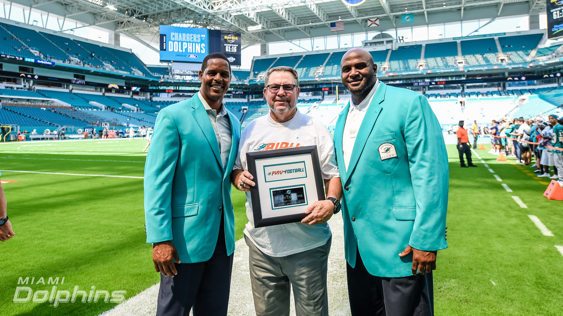 The high school coach of the week selection will celebrate those with long-standing tenure in the coaching community, paying tribute to Don Shula’s 50th season with the Miami Dolphins organization. Every award recipient is given tickets to a Miami Dolphins home game. They are also presented with a plaque during a break in the game on the field at Hard Rock Stadium. The gameday program also acknowledges their achievements along with the Miami Dolphins’ social media platforms. Along with that, the Fins also recognize a team of the week on-field during the national anthem.