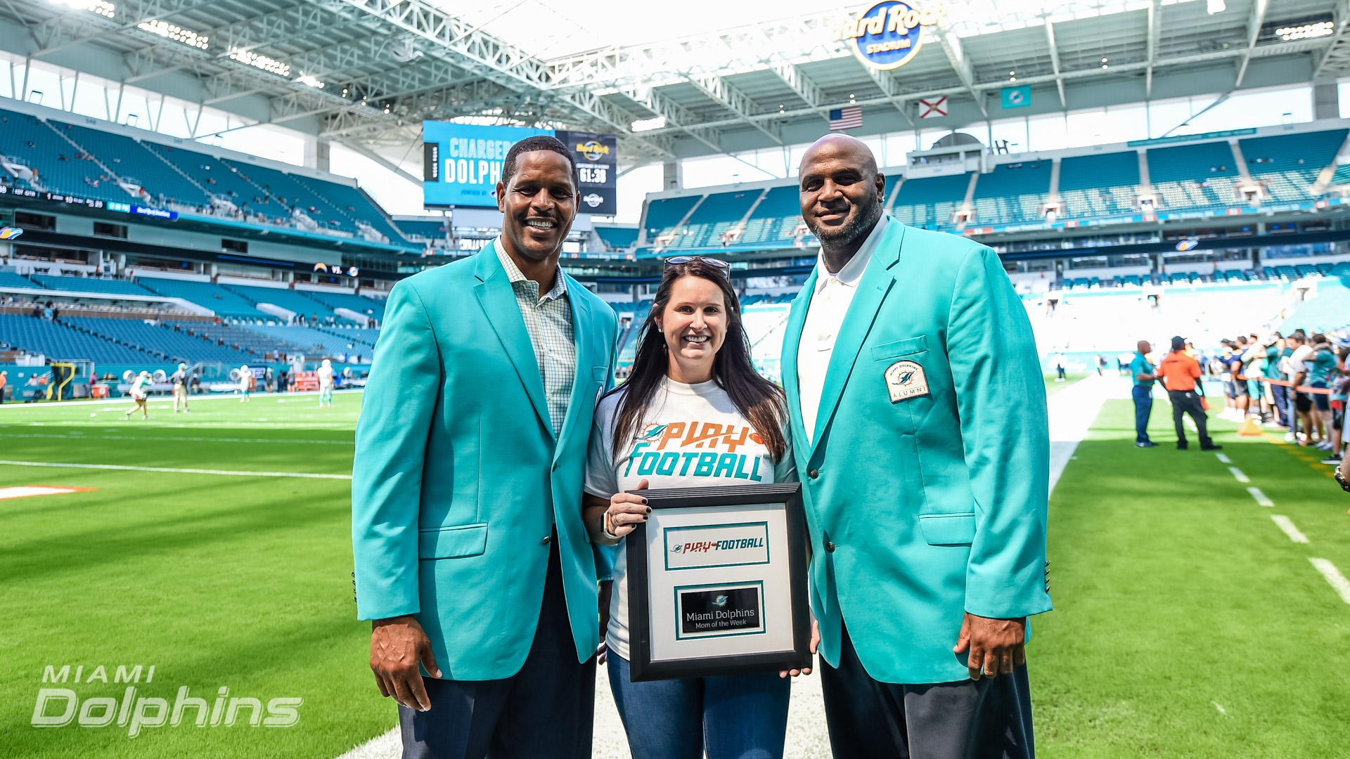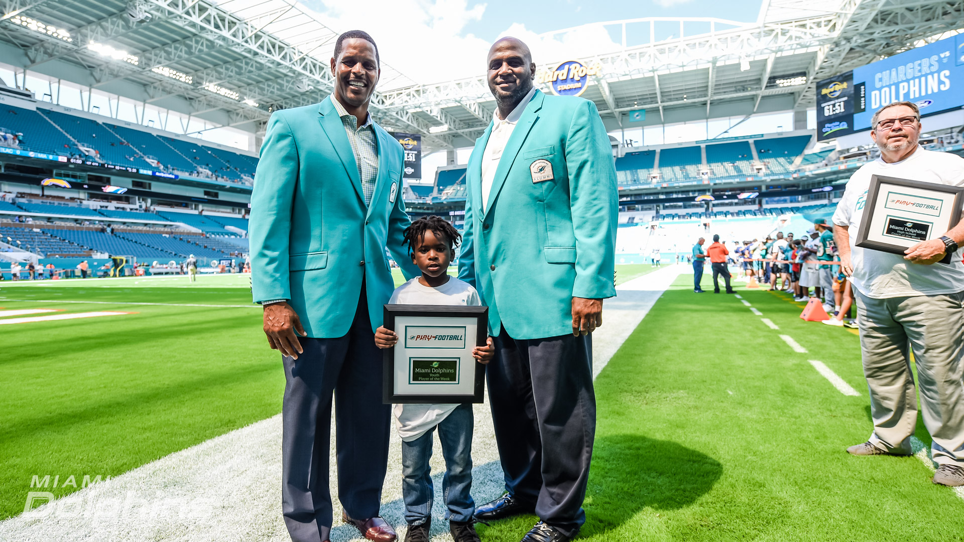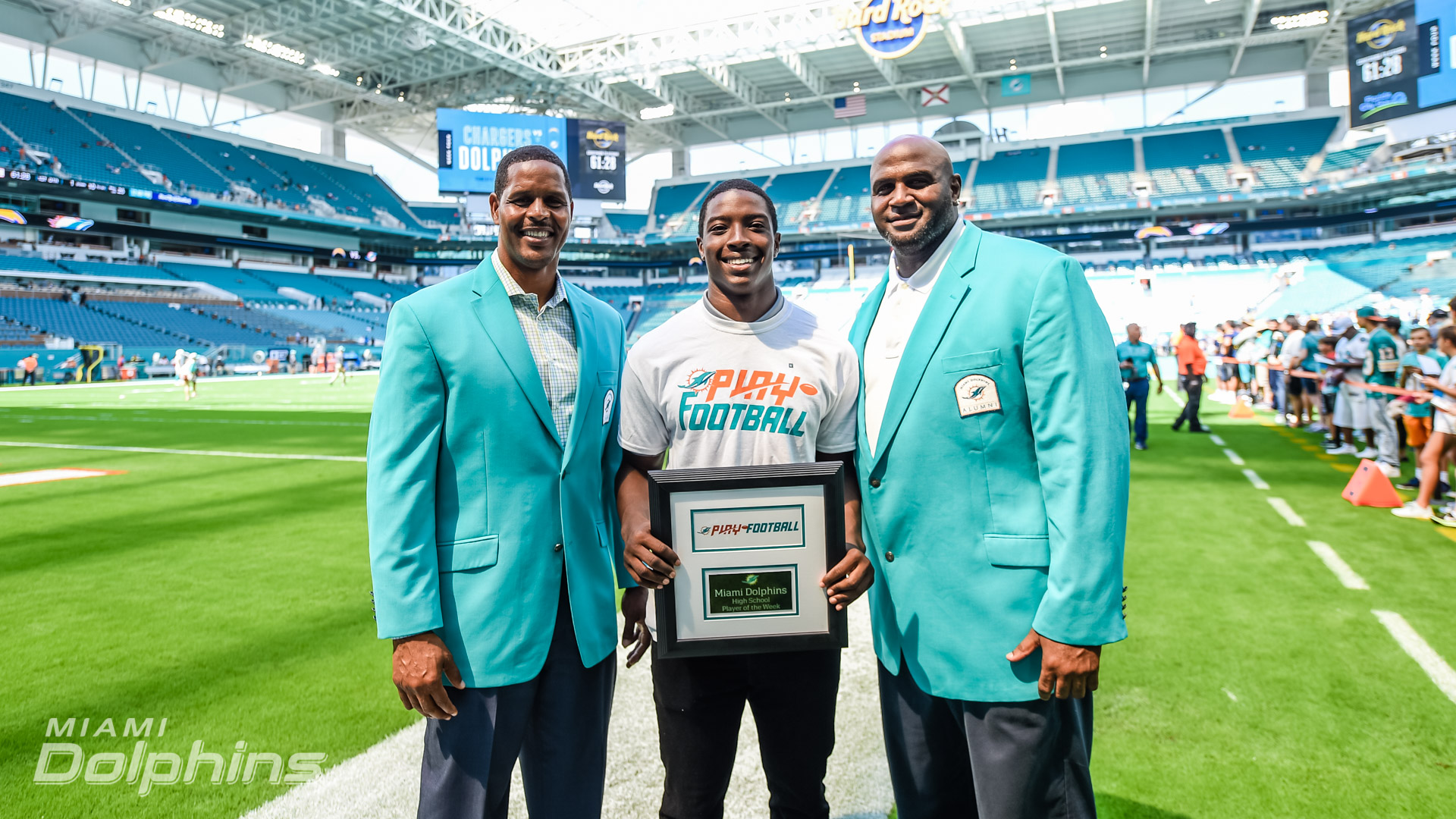 Miami Gardens, FL – Celebrating members of our community that do good work has been part of the Miami Dolphins M.O. for years. Commemorating these people not only highlights what they’re doing in the community, it also creates an example for the rest of the community to follow. Every home game, the Miami Dolphins Play Football program selects a high school coach of the week, high school player of the week, youth player of the week and team mom of the week. The program was created to revere youth football in South Florida.