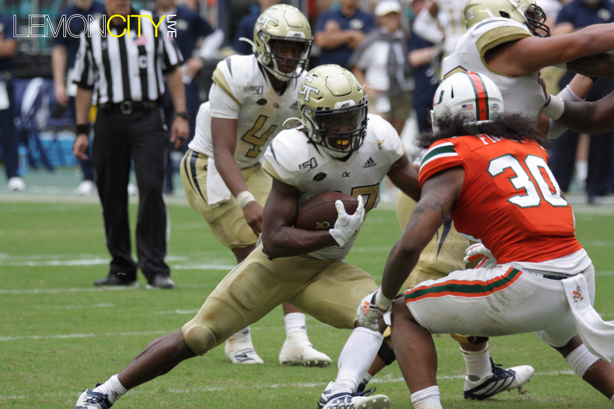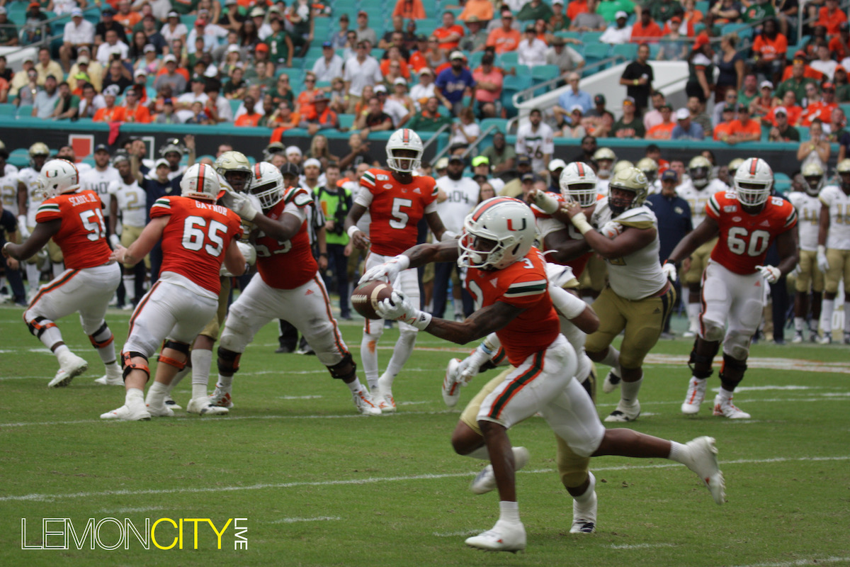 Miami was saved with a gift from the refs early in the fourth. Jamious Griffin broke tackles including one from Al Blades Jr., seemingly taking it to the house for the score. Upon further review, the runner was ruled out of bounds five yards into the play. A short time later, the Yellow Jackets coughed up the ball for the turnover chain, their lone occurrence.