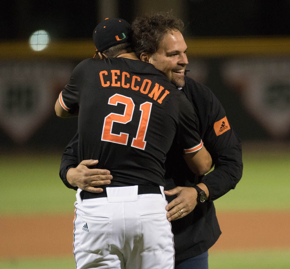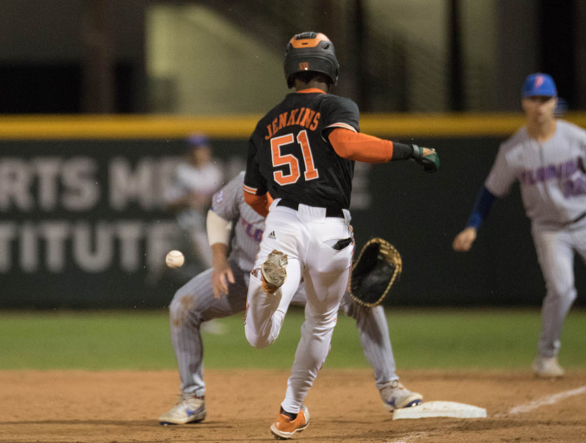 Again, the Canes had a chance to put up more runs, this time in the eighth. Vilar got walked and moved into scoring position on a wild pitch. He was left stranded as Del Castillo struck out looking. The fans stayed fired up all night long, doing the wave late game and arm claps in rhythm to the music blaring through the stadium’s speakers. Not sure if it was to stay warm or stay loose… or both. They rallied to their team chanting “Let’s go Canes!” showing loyalty and faith. Then during the 10th, a key call was made by the umps that impacted Miami’s fortunes. Tony Jenkins laid down a great bunt, resulting in an error at first base by Florida. Pinch-runner Chet Moore who subbed in for Gates moved over to third in the play. Miami was on the verge of a walk-off.