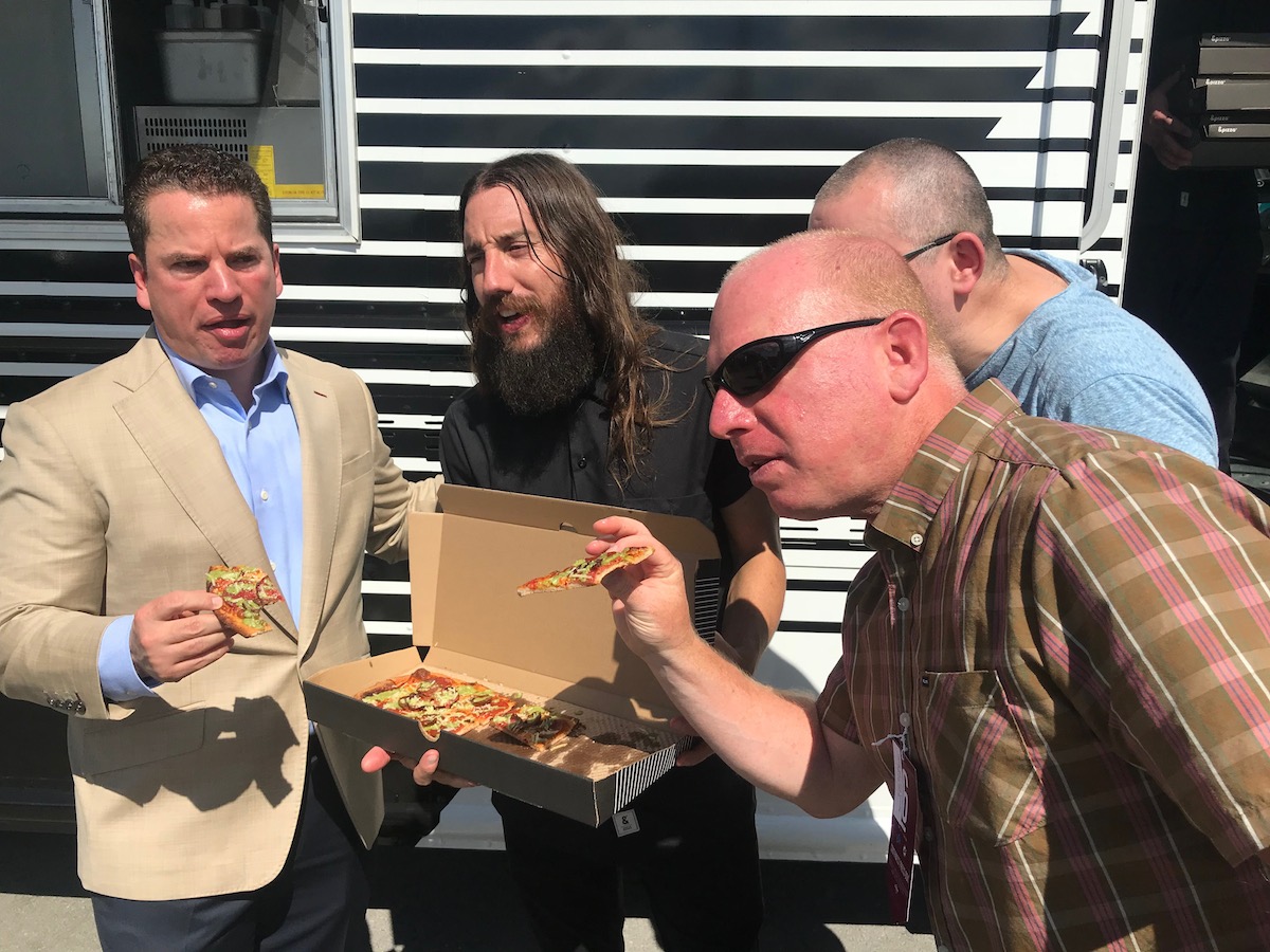 Miami Dolphins Vice Chairman, Matt Higgins and &pizza CEO, Michael Lastoria hand out pizza to tailgaters!