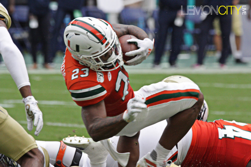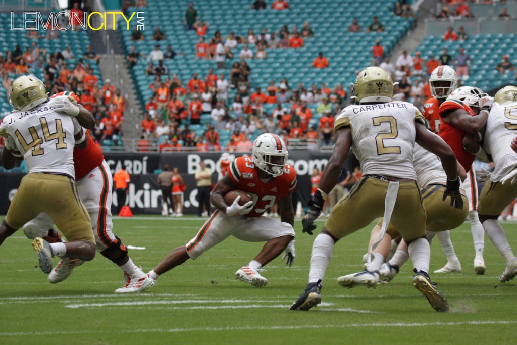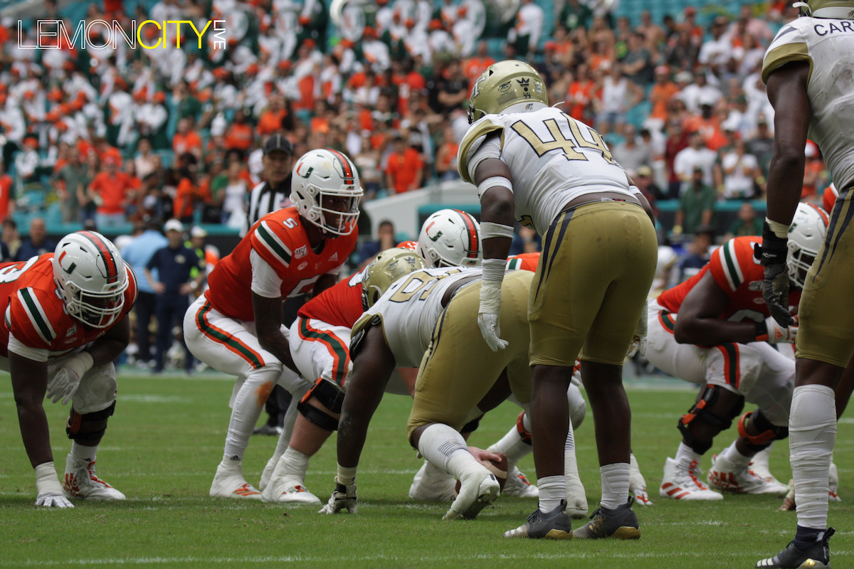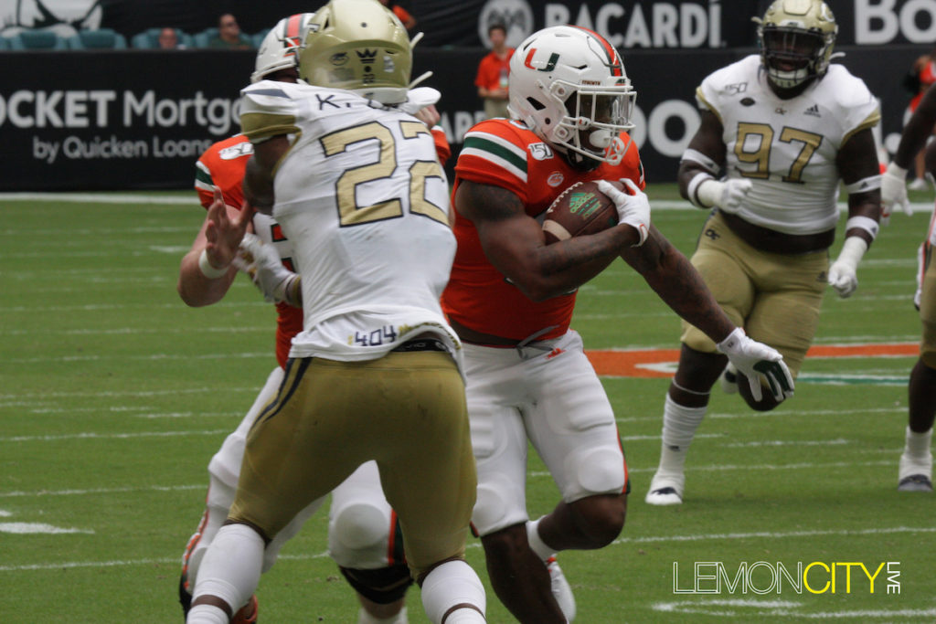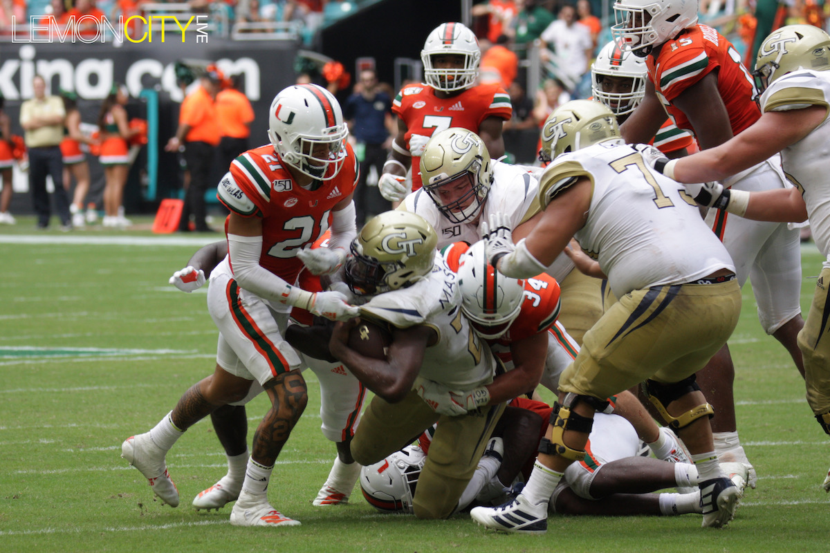 Miami was saved with a gift from the refs early in the fourth. Jamious Griffin broke tackles including one from Al Blades Jr., seemingly taking it to the house for the score. Upon further review, the runner was ruled out of bounds five yards into the play. A short time later, the Yellow Jackets coughed up the ball for the turnover chain, their lone occurrence.