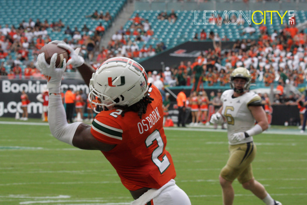 The Hurricanes struck back with two TDs of their own, the first by Perry doing an assisted quarterback sneak followed by another on a one-play, 13-yard connection to K.J. Osborn.