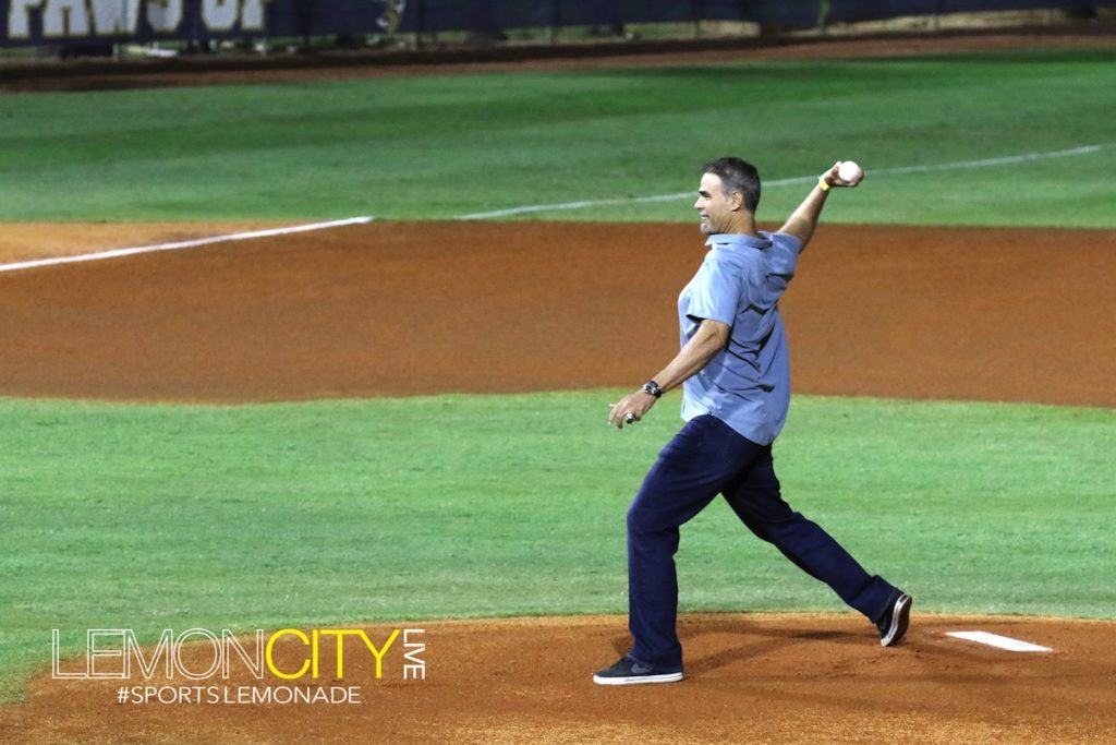 Two time World Series Champion, 2007 World Series MVP and FIU Alumni Mike Lowell throwing out the first pitch at the game.
