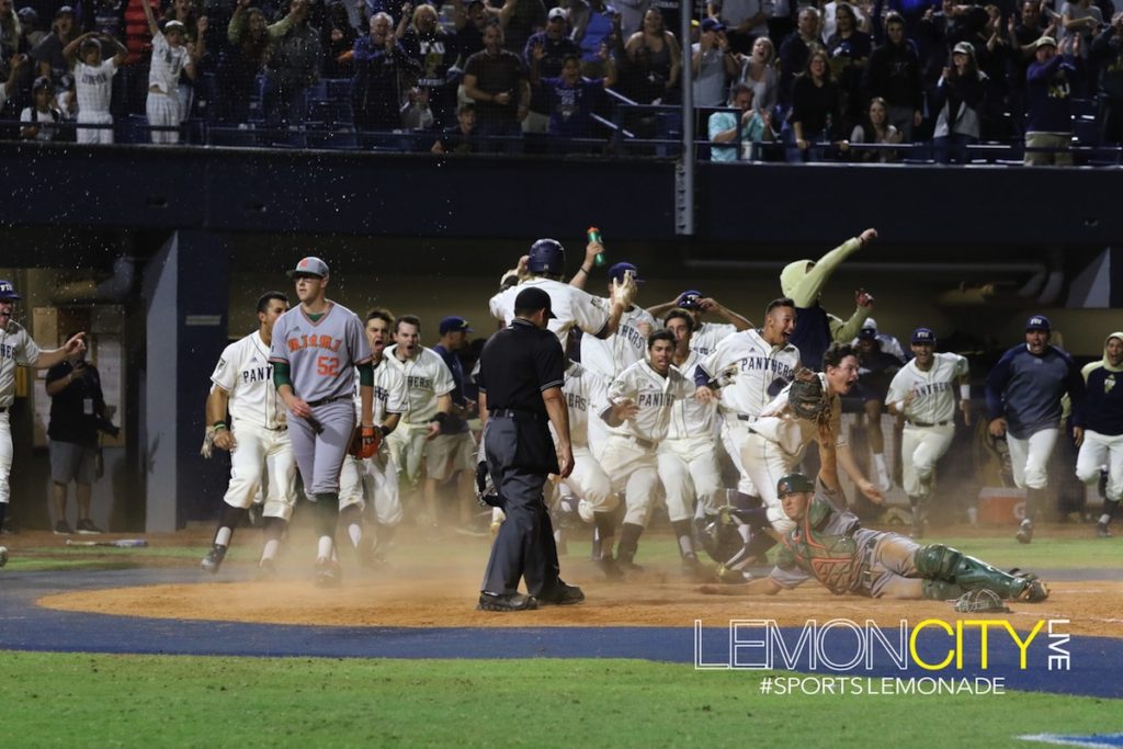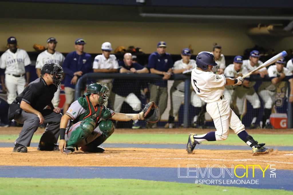 The game is now tied, and the Canes are fuming. Apparently, they decided to take out their aggressions on the visitor’s dugout. Let’s move into the top of the 9th inning. Michelangeli is on 1st base with 1 out, and Joe Gomez grounds a ball into the infield. Michelangeli slides hard into 2nd, trying to break up the double play, but 2nd baseman Derek Cartaya wasn’t fazed, as he makes a spectacular play at 2nd, and throws out Gomez at first to end the inning for the Canes. The trash-talking would reach it’s climax at this point, as both Cartaya and Michelangeli, better known as the Bat-Flip King, would all but whisper sweet nothings at each other all the way to their respective dugouts. Bottom of the 9th. Designated hitter, JC Escara hits a single, and is replaced by pinch runner Kolby Follis, who advanced to 2nd base off a sac-bunt. Then, pandemonium would ensue, as Nick Day would blast a ball into the warning track, forcing Carl Chester to make one of the more spectacular over the shoulder catches I’ve seen, but it would be overshadowed by the base-running of Kolby Follis. The dude tagged up from second base, booked it all the way home, avoided the tag at the plate and completed the walk-off victory!